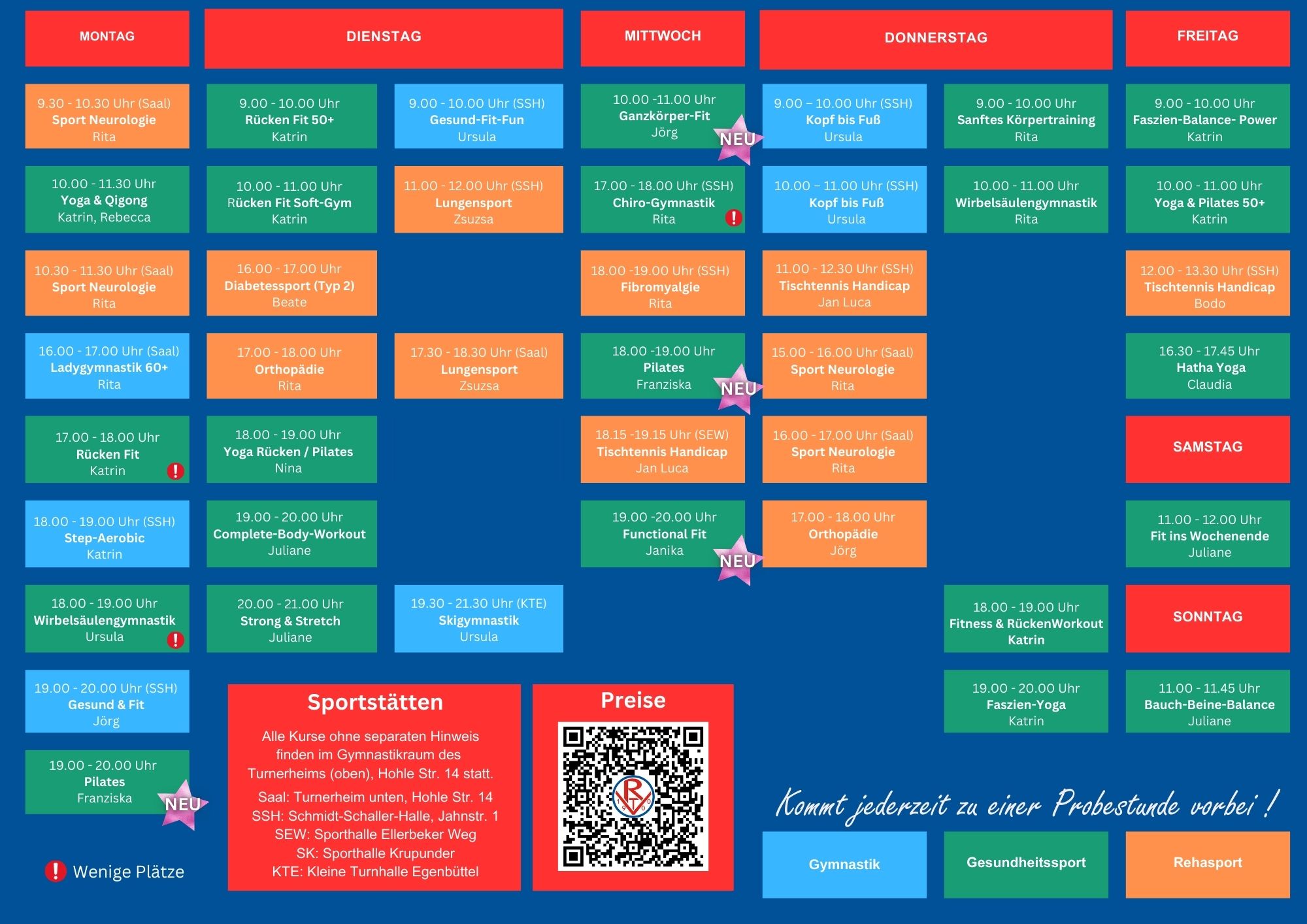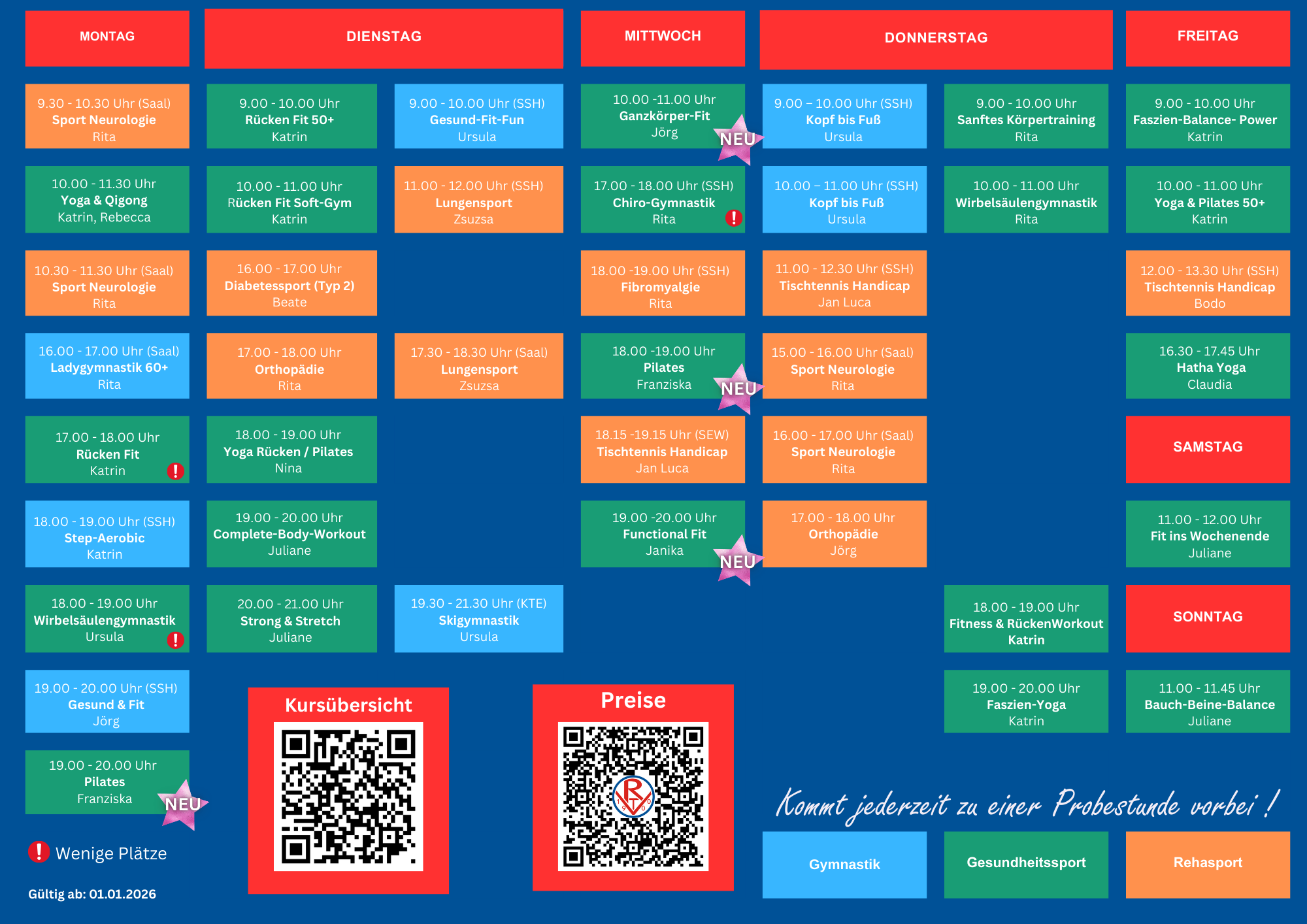 Ein Einstieg in laufende Kurse ist jederzeit möglich – probiere einfach eine Probestunde aus! Bitte beachte, dass in einigen Kursen Wartelisten bestehen. Bei Fragen wende dich einfach an die RTV-Geschäftsstelle. Über das Ampelsymbol siehst du, welche Kurse noch freie Plätze haben.