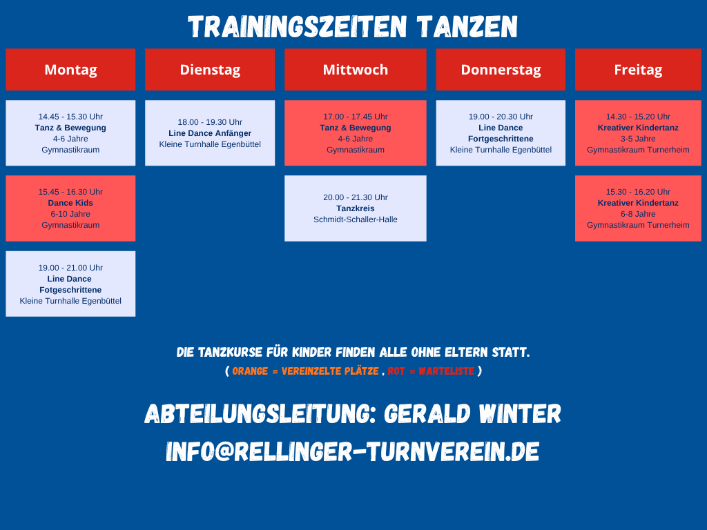 Ob ganz klein oder ganz groß – Tanzen macht Spaß und bringt unheimlich viel Freude. Beim RTV starten die Tanzgruppen bereits ab 3 Jahren mit dem Kindertanz , Tanz & Bewegung und Dance Kids. Für unsere Erwachsenen geht es im Tanzkreis beschwingt weiter. Zudem gibt es für alle, die gerne alleine tanzen unsere Line Dance Tanzgruppen. Die Tanzgruppen für Kinder am Montag beginnen ab ca. 2026.